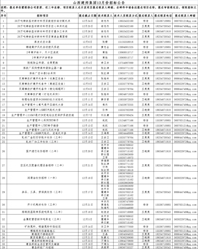 我公司十二月份擬對以下項目進行自主招標。意向客戶請撥打報名電話,索取相關招標文件及投標保證金賬號。