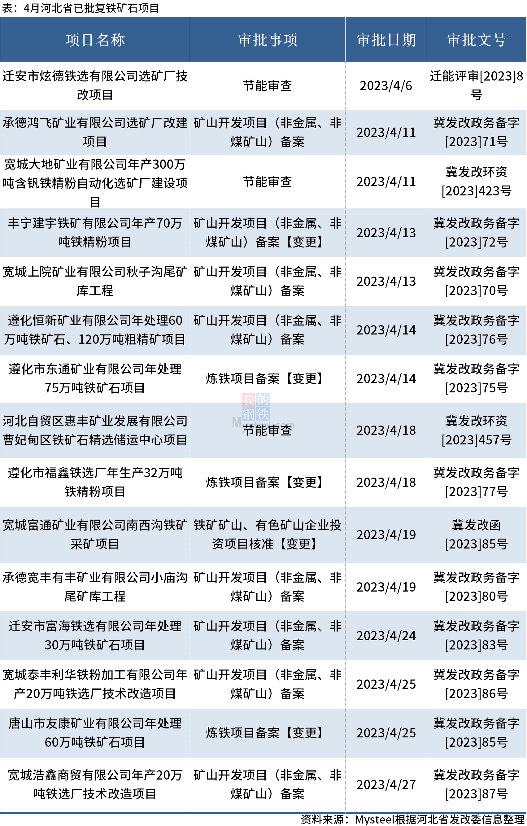 據(jù)Mysteel不完全統(tǒng)計,2023年4月河北省共批復(fù)鐵礦石相關(guān)項目15個,分別是8個礦山開發(fā)項目(非金屬、非煤礦山)備案【變更】、3個節(jié)能審查、1個鐵礦礦山、有色礦山企業(yè)投資項目核準(zhǔn)【變更】和3個煉鐵項目備案【變更】。