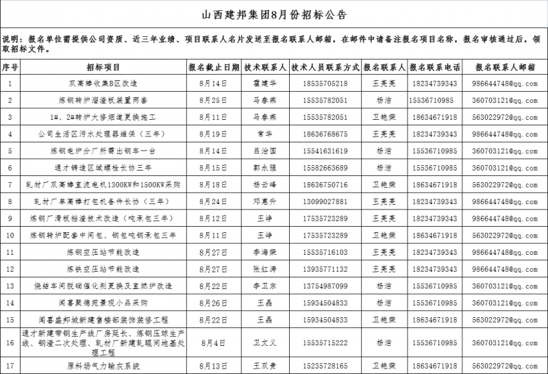 我公司八月份擬對以下項目進行自主招標。意向客戶請撥打報名電話,索取相關招標文件及投標保證金賬號。