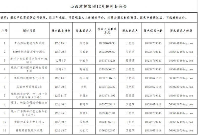 我公司十二月份擬對(duì)以下項(xiàng)目進(jìn)行自主招標(biāo)。意向客戶請(qǐng)撥打報(bào)名電話,索取相關(guān)招標(biāo)文件及投標(biāo)保證金賬號(hào)。