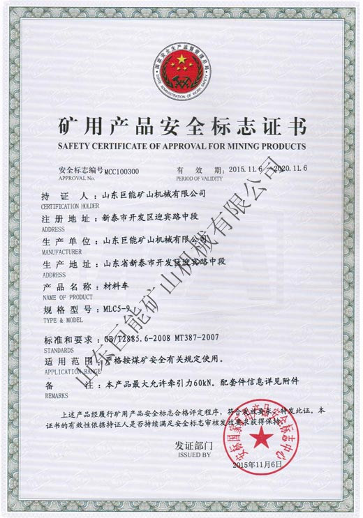 | 發(fā)證機構(gòu): | 安標(biāo)國家礦用產(chǎn)品安全標(biāo)志中心 | 發(fā)證時間 : | 2015-11-06 |