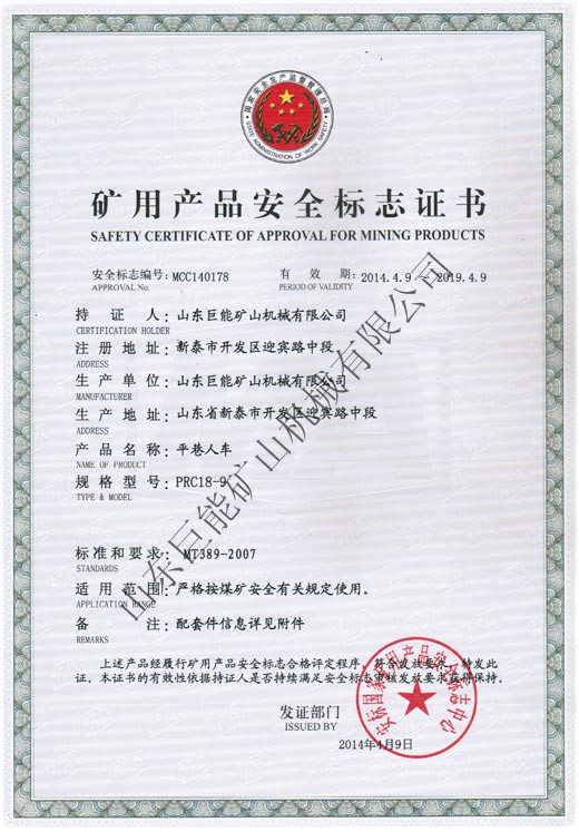 | 發(fā)證機(jī)構(gòu): | 安標(biāo)國家礦用產(chǎn)品安全標(biāo)志中心 | 發(fā)證時(shí)間 : | 2014-04-09 |