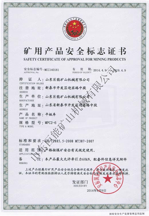 證書介紹 MPC2-6平板車 礦用產(chǎn)品安全標(biāo)志證書