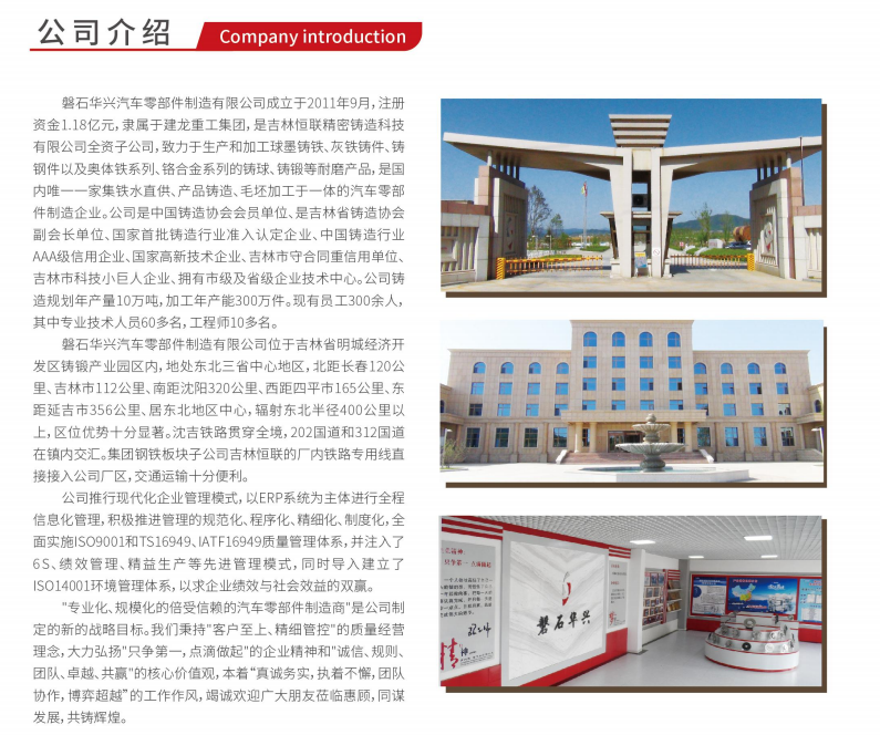磐石華興汽車零部件制造有限公司成立于2011年9月,注冊資金1.18億元,隸屬于建龍重工集團,是吉林恒聯(lián)精密鑄造科技有限公司全資子公司,致力于生產(chǎn)和加工球墨鑄鐵、灰鐵鑄件、鑄鋼件以及奧體鐵系列、鉻合金系列的鑄球、鑄鍛等耐磨產(chǎn)品,是國內(nèi)唯一-家集鐵水直供、產(chǎn)品鑄造、毛坯加工于一體的汽車零部件制造企業(yè)。