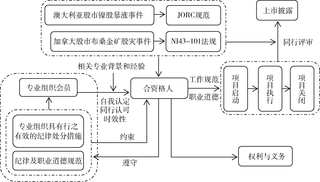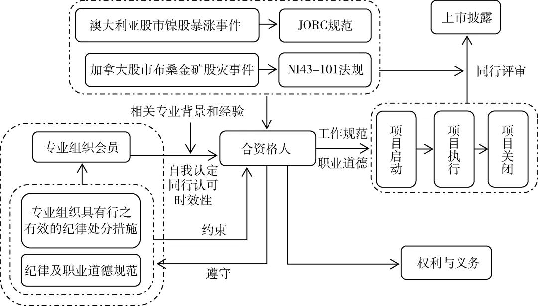 建立合資格人制度的國家均對合資格人進(jìn)行了定義,見表1。簡要概括基本包含以下幾點(diǎn):具有相關(guān)專業(yè)背景和經(jīng)驗(yàn)(要求至少5年相關(guān)經(jīng)驗(yàn));國內(nèi)國際認(rèn)可的專業(yè)組織會員;遵守所屬專業(yè)組織紀(jì)律或者職業(yè)道德規(guī)范;專業(yè)組織具有行之有效的紀(jì)律處分措施。合資格人體系見圖1。 表1 主要礦業(yè)國家專業(yè)組織合資格人定義