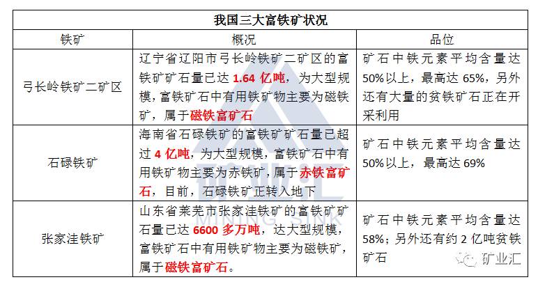 我國富鐵礦資源大多數(shù)零散的分布在約300個礦區(qū)中,能構(gòu)成單獨(dú)開采的大型富鐵礦只有遼寧省遼陽市弓長嶺鐵礦二礦區(qū)、海南省石碌鐵礦、山東省萊蕪市張家洼鐵礦等幾處。