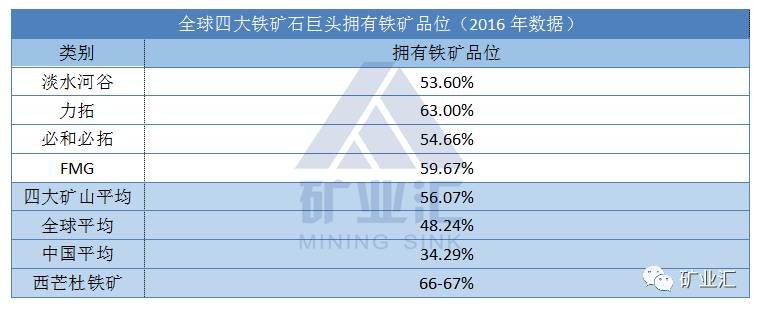 目前,四大巨頭掌握著全球主要的富鐵礦,2016年,淡水河谷、力拓、必和必拓和FMG鐵礦石品位分別為53.60%、63.00%、54.66%以及59.67%,平均品位為56.07%,超過了全球48.24%的平均值,更是將中國34.29%的平均鐵礦品位甩在身后。